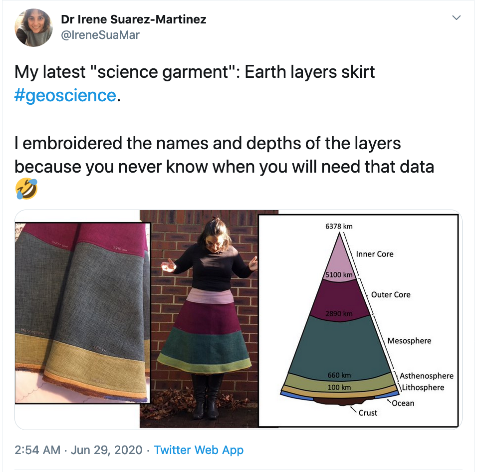 Dr Irene Suarez-Martinez (@IreneSuaMar) shows off a cool skirt with the names and depths of earth layers.